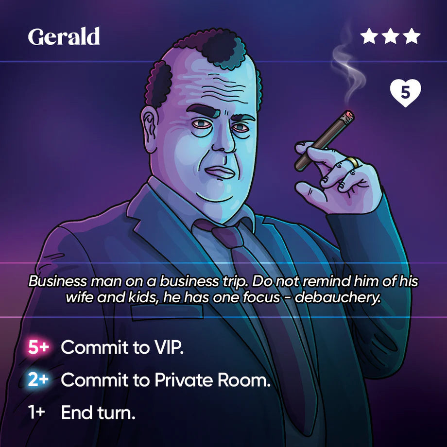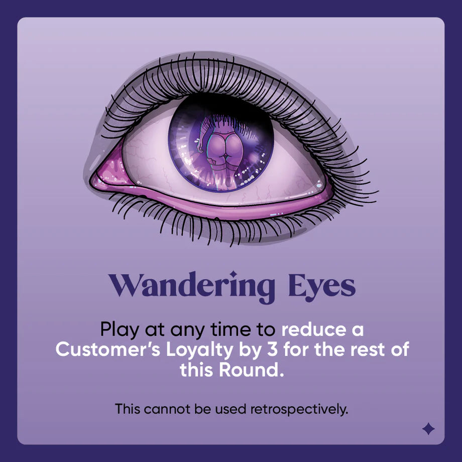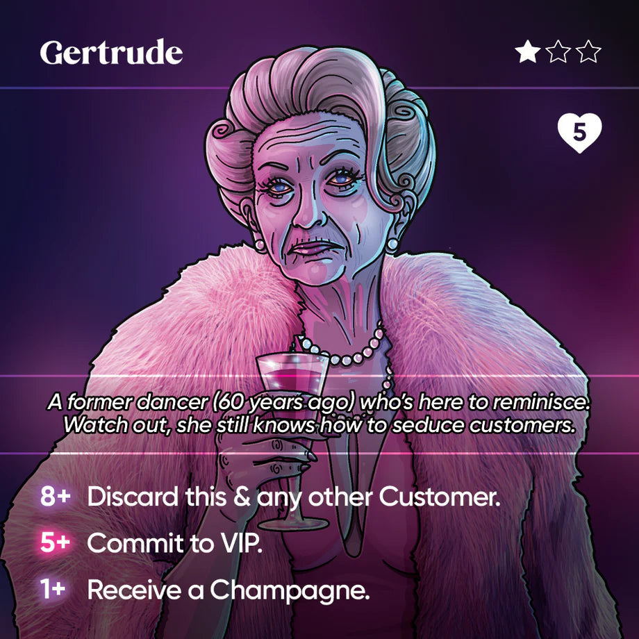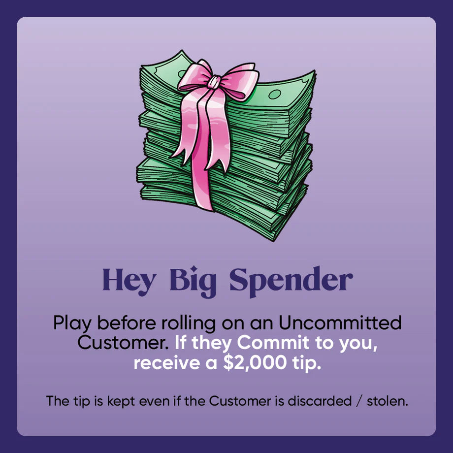 Players adopt the role of a Dancer and must charm worthwhile Customers into emptying their wallets. The Player with the most money at the end of the night wins. Be careful about interfering with another Dancer’s Customer, or your night may not run so smoothly...